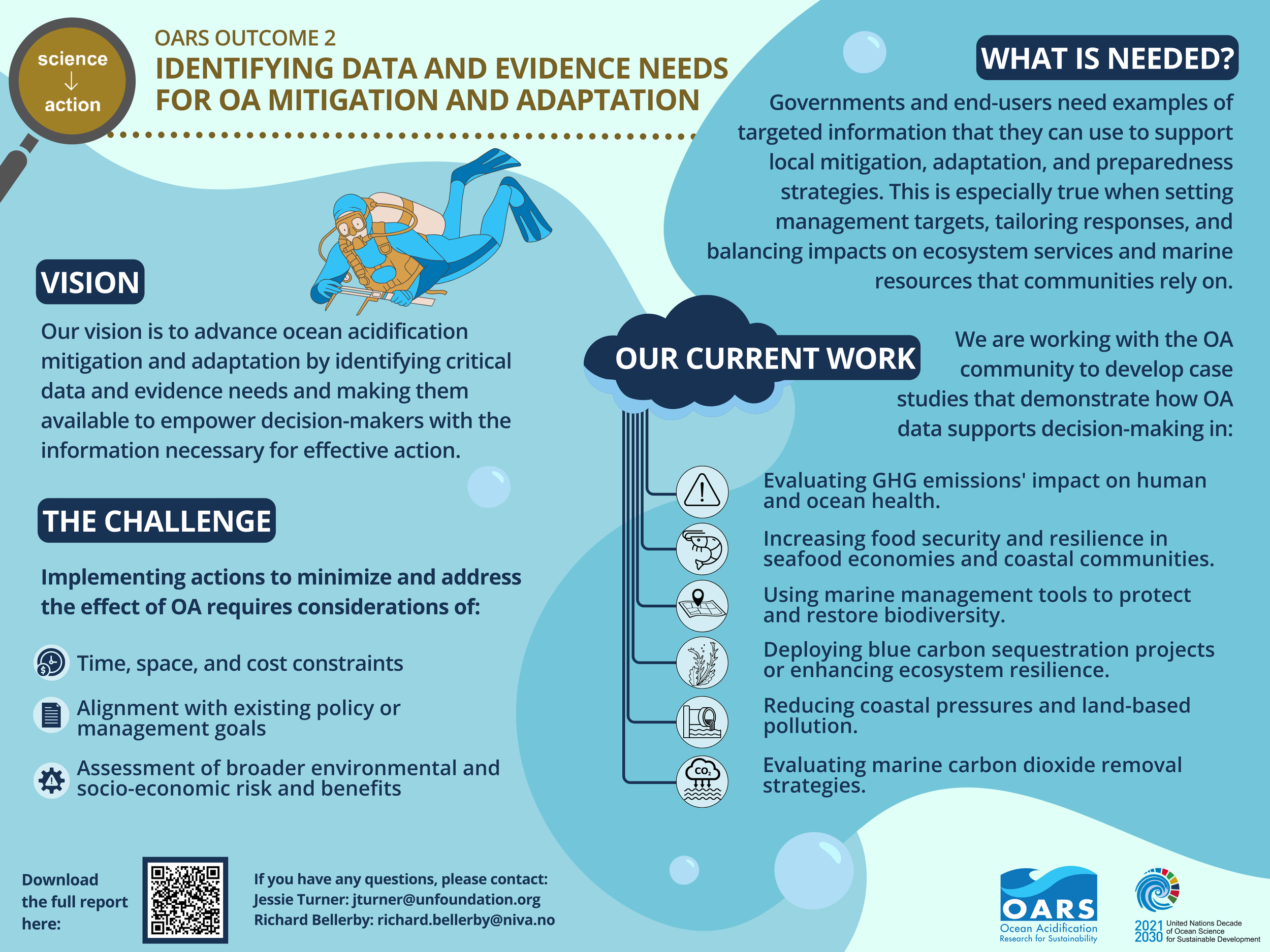 The Working Group for OARS Outcome 2 is helping to prioritize monitoring, research, and information for tangible outcomes by considering the information and tools needed for specific decisions and actions. Targeted information can help policymakers, resource managers, stakeholders, and communities better understand impacts of OA on marine resources, and enable them to identify the most appropriate mitigation or adaptation actions to minimize and address the effect of OA.